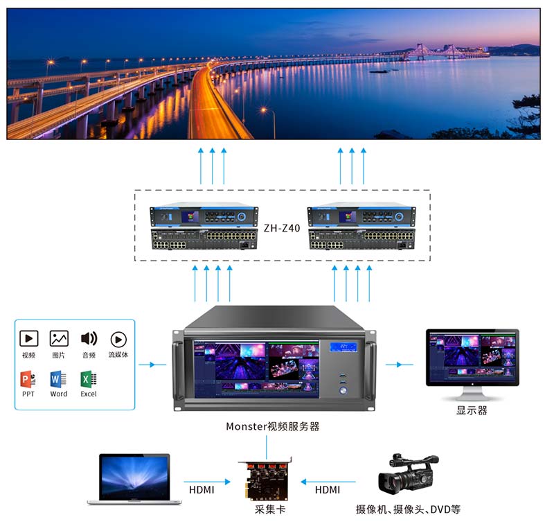 中航ZH-Z900視頻服務器是中航軟件為滿足舞臺、酒吧、多媒體展廳、會議室等不同應用場景LED大屏精心打造的一款集成播控服務器。最大支持8路3840x2160@60Hz超大分辨率點對點顯示。可以實現功能超強的音視頻播放、多場景編排功能,根據需求靈活配比,使用戶管理便捷、操作簡單,獲得更好的應用使用效果。