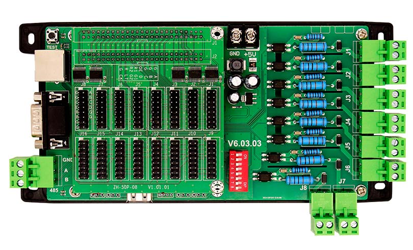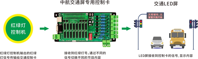 本產品為交通信號屏專用控制卡,根據不同的紅綠燈信號(左轉紅、左轉綠、直行紅、直行綠)智能的切換不同的顯示內容。顯示內容由用戶自主設置。