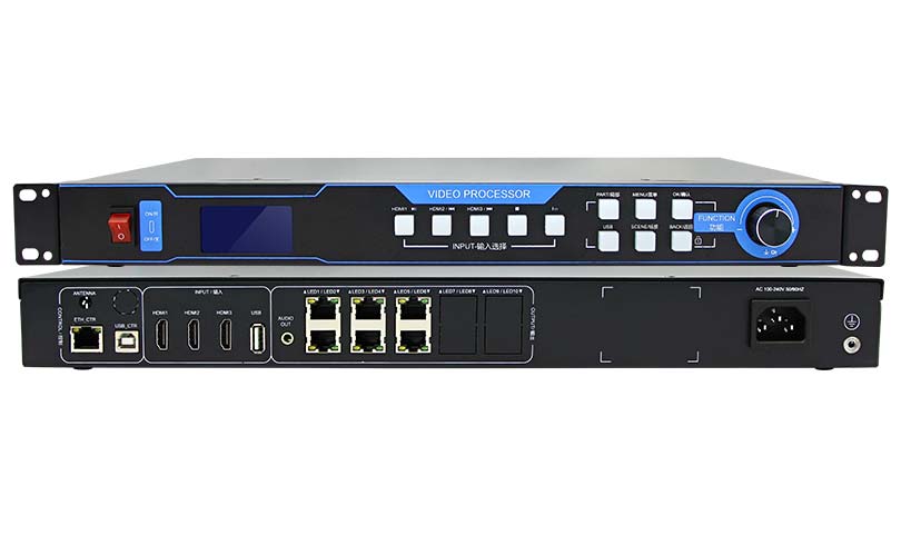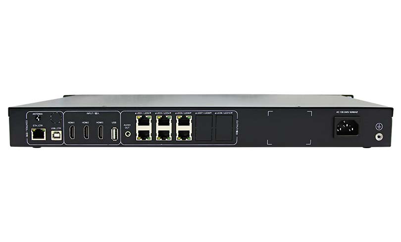 · 支持以下輸出信號接口:LAN(RJ45)×6(帶網口連接狀態指示),整機最大支持分辨率為390萬像素,支持自定義分辨率,最寬16384像素,最高4096像素;Audio音頻(PJ35)×1;