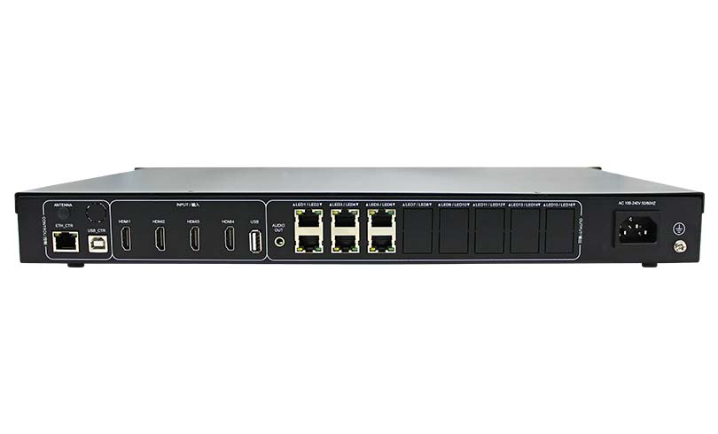 · 支持以下輸出信號接口:LAN(RJ45)×6(帶網口連接狀態指示),整機最大支持分辨率為390萬像素,支持自定義分辨率,最寬16384像素,最高4320像素;Audio音頻(PJ35)×1;