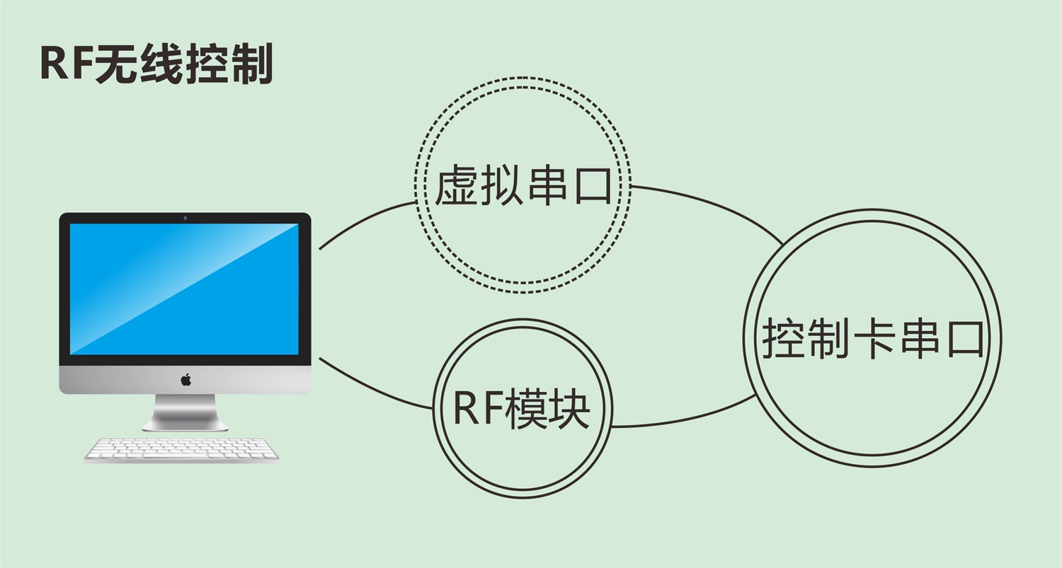 工作原理:RF模塊一端接到控制電腦,另一端接到控制卡串口,電腦安裝驅動程序后,產生一個虛擬串口,并通過此串口發送數據。