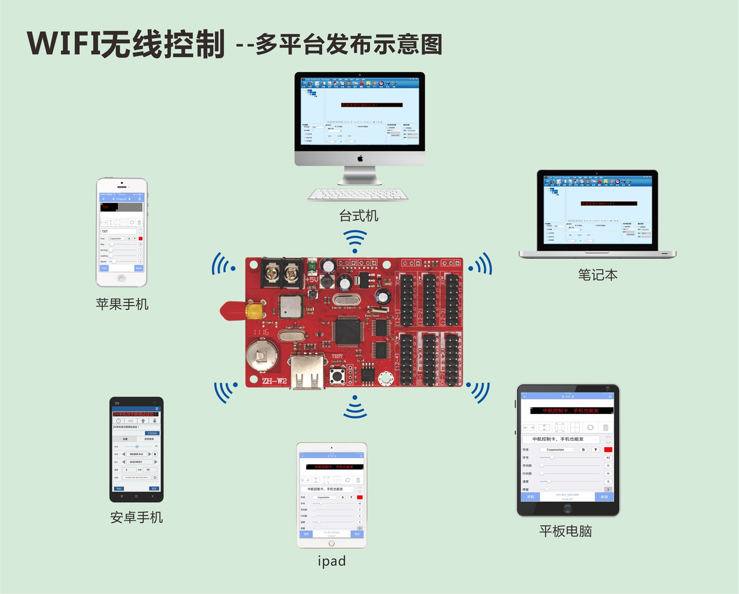 對于LED控制系統,一方面:WIFI卡就相當于一個無線路由器,打開手機WIFI找到控制卡發出的信號(ZH-W開頭的WIFI信號)連接,再進入操作軟件LED魔寶操作;另一方面:WIFI芯片幾乎決定控制卡的信號強度、信號穩定性及長時間運行是否頻點漂移。