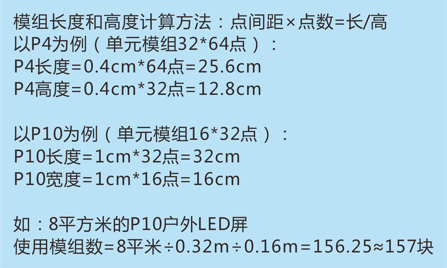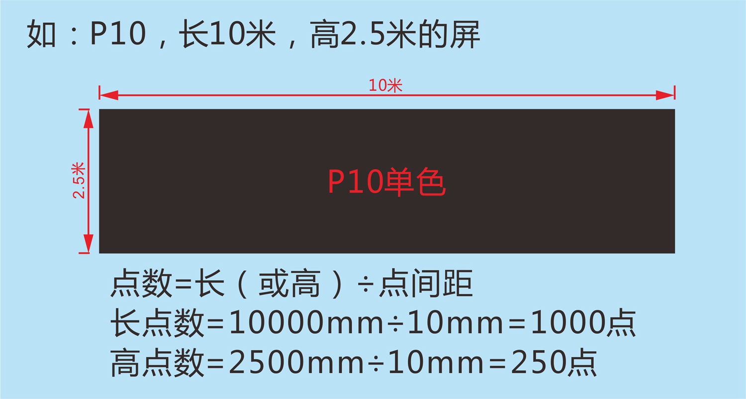 每個像素點可以是一顆LED燈(1R)、兩顆LED燈(1R1G)、三顆LED燈(2R1G)。P10的點間距為10mm;P12的點間距為12mm......(點間距以毫米為單位計量)