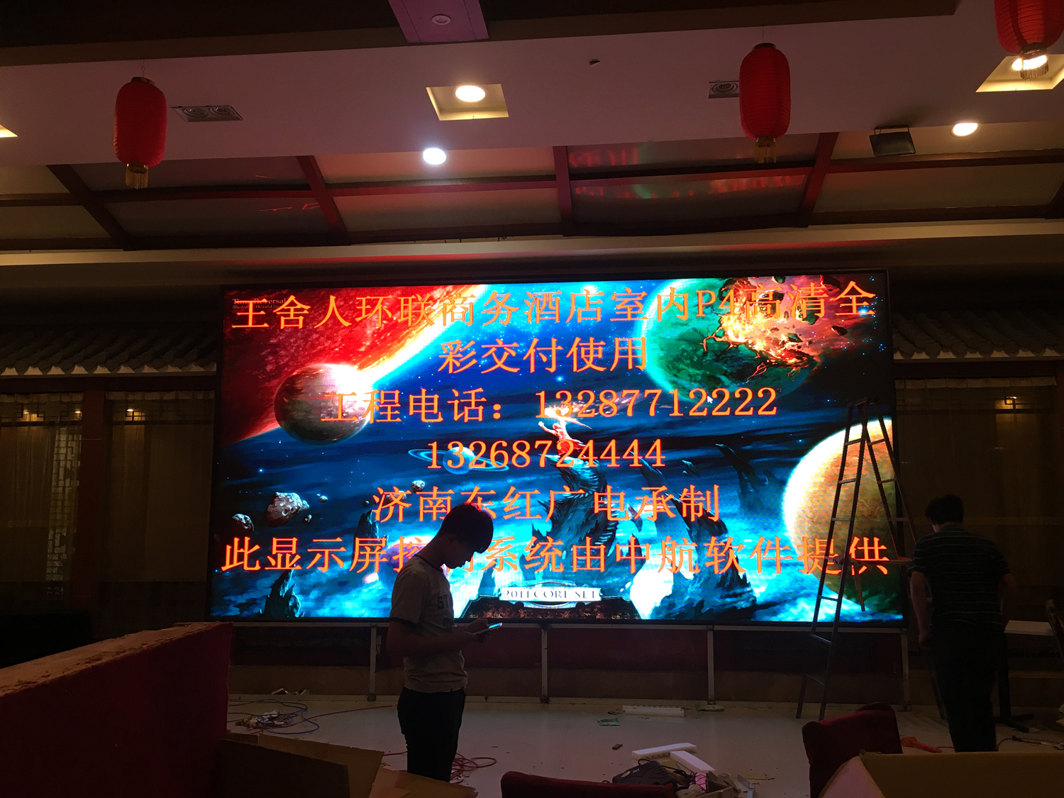 山東省濟南市環聯商務酒店 室內P4 ,總點數1472×736,1張發送卡,10張接收卡完美帶載!單卡最大帶載320×384,感謝濟南東紅光電徐總對中航的信任和認可,我們會更加努力!