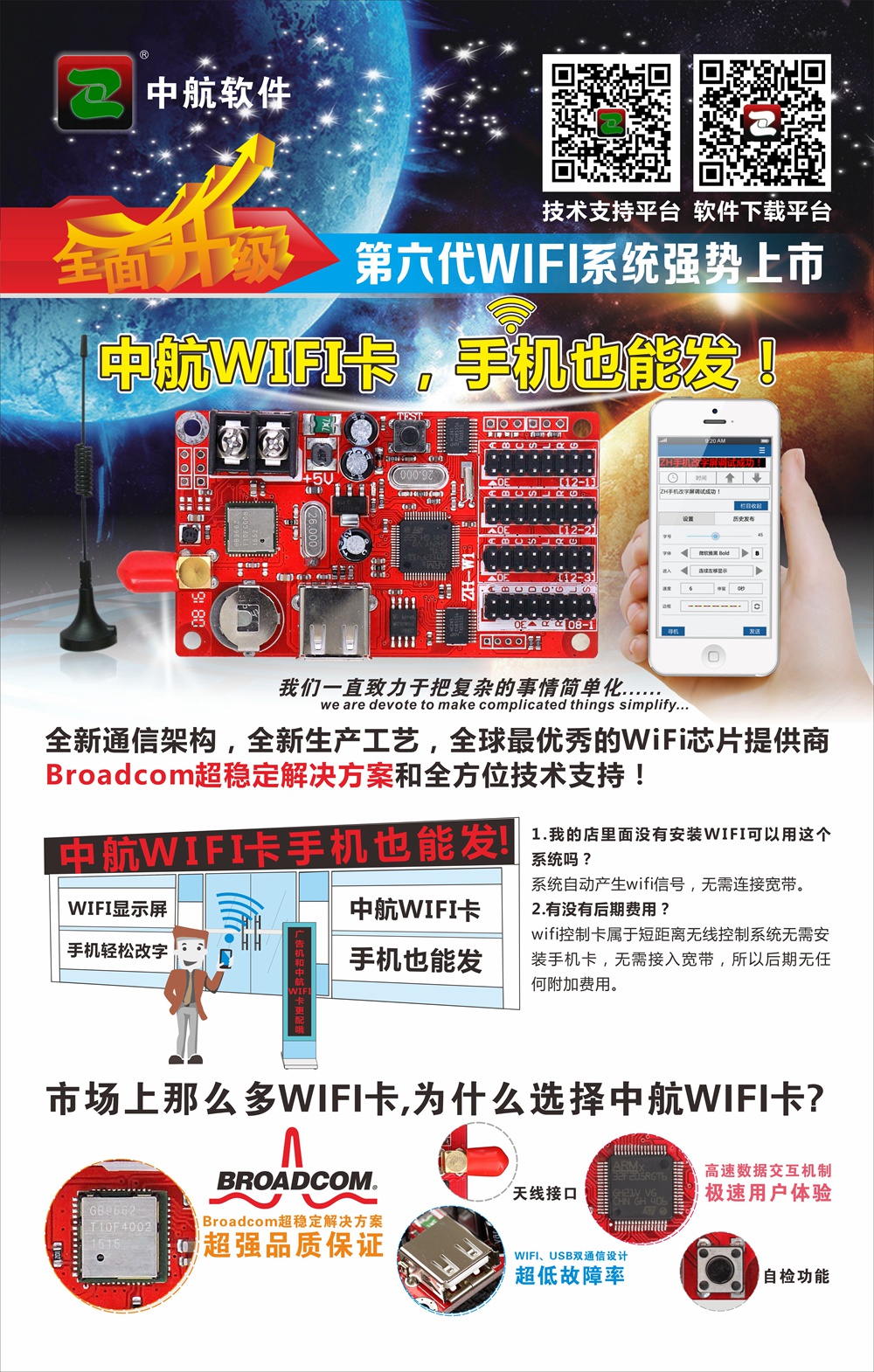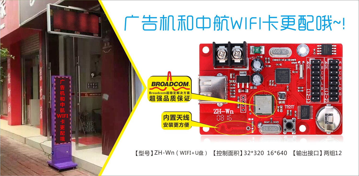 廣告機和Wi-Fi控制卡更配哦,中航軟件第六代WiFi系統,全新通信架構,全新生產工藝,全球最優秀的WiFi芯片提供商Broadcom超穩定解決方案和全方位技術支持!為您做最好廣告機保駕護航!