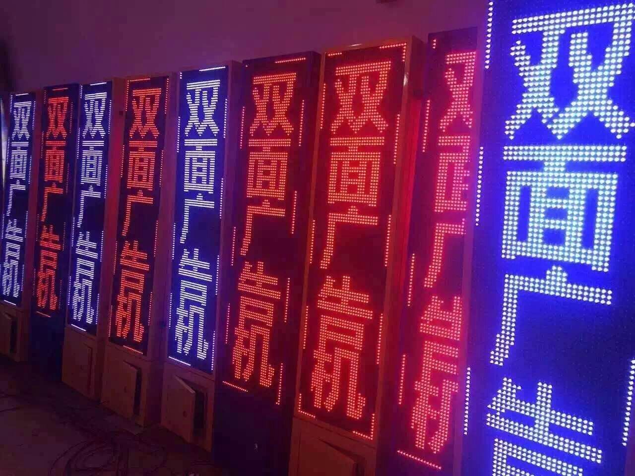 一般市面上采用P10單元板,外框材質多采用冷軋板高溫烤漆,發光顏色可定制紅綠黃白藍紫等,前后雙面獨立顯示廣告。優點:攜帶、移動方便,手機操作極其方便。可廣泛用于小商品城、電子城、擺攤、臨街商鋪等廣告促銷。