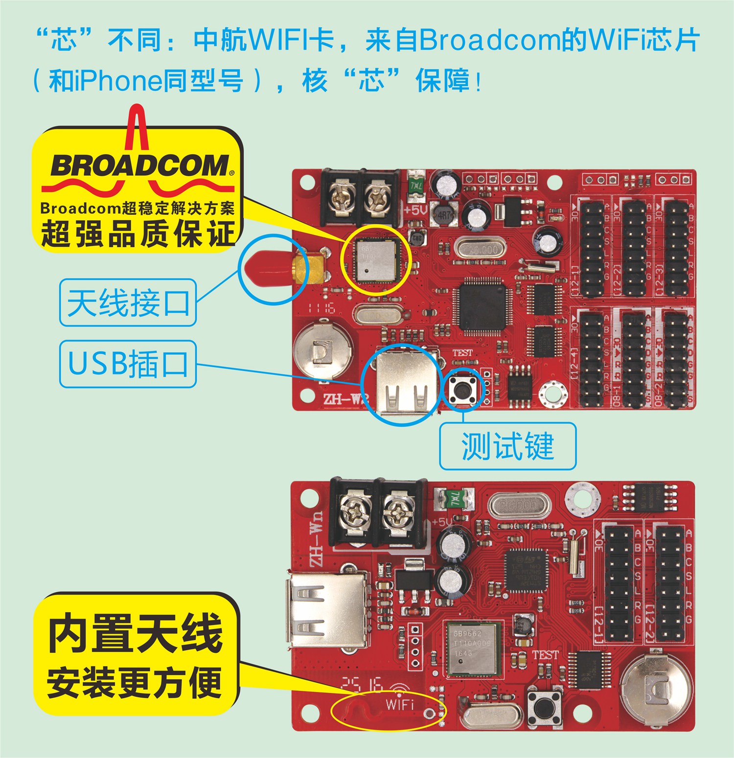 對(duì)于LED控制系統(tǒng),一方面:WIFI卡就相當(dāng)于一個(gè)無線路由器,打開手機(jī)WIFI找到控制卡發(fā)出的信號(hào)(ZH-W開頭的WIFI信號(hào))連接,再進(jìn)入操作軟件LED魔寶操作;另一方面:WIFI芯片幾乎決定控制卡的信號(hào)強(qiáng)度、信號(hào)穩(wěn)定性及長(zhǎng)時(shí)間運(yùn)行是否頻點(diǎn)漂移。