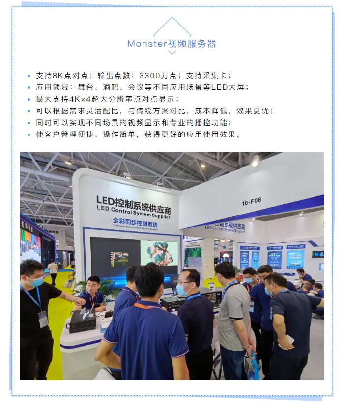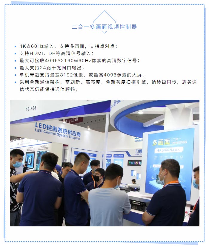 本屆展會,中航重磅推出:二合一多畫面視頻控制器、Monster視頻服務(wù)器、二合一視頻控制器、同異步三合一主控、戰(zhàn)狼系列發(fā)送器+接收卡、工程專用異步播放系統(tǒng)、遠(yuǎn)程4G云發(fā)送集群系統(tǒng)、門楣條屏系統(tǒng)等一系列產(chǎn)品。展會期間,二合一多畫面視頻控制器備受熱捧,現(xiàn)場參觀賓朋紛紛體驗,氣氛熱烈。