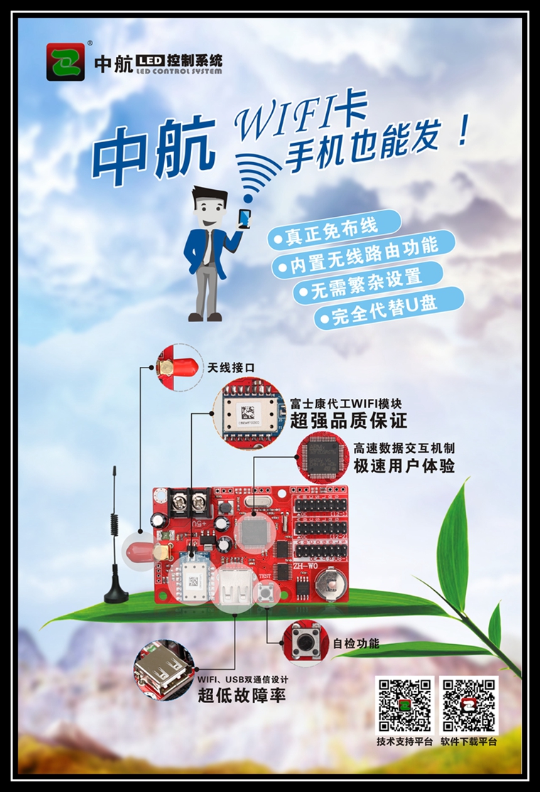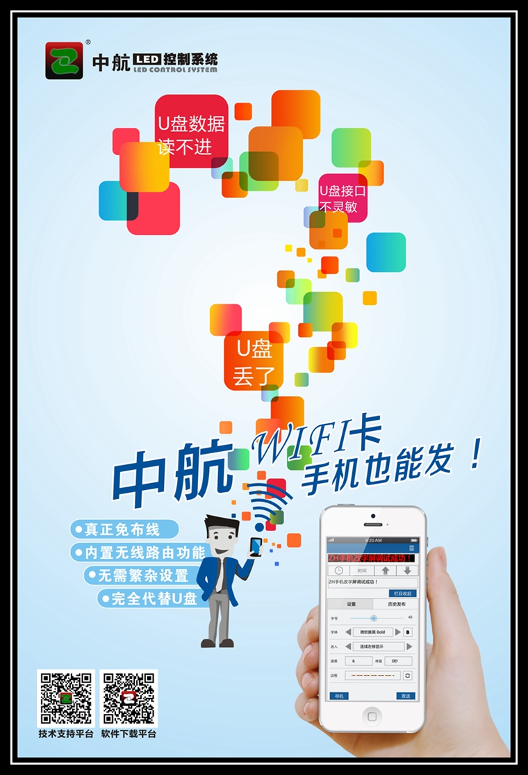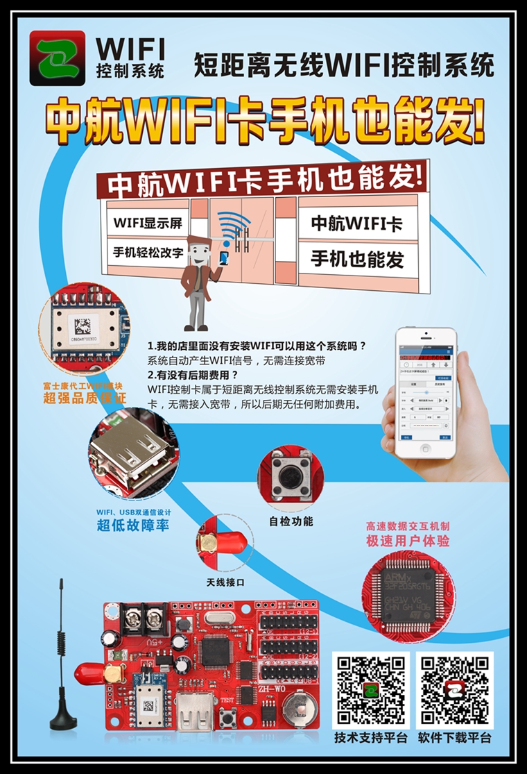 我公司推出V3版WiFi控制系統,軟件操作簡單好用,免布線、免U盤、無需連接寬帶,更無后期任何附加費用,高質量方案,更容易被行業人員所接受使用,我們相信中航無線WiFi控制系統正在創造另一個神話——無線WiFi控制卡取代U盤控制卡成為市場主流產品。